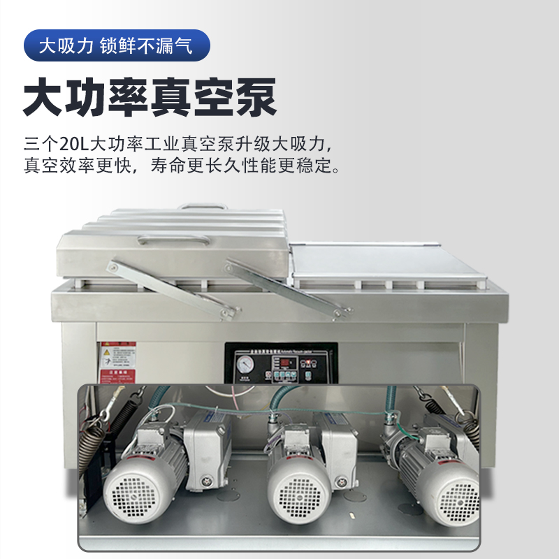 雙室真空包裝機通過 “雙真空室輪換作業” 實現抽真空與裝袋無縫銜接,核心是利用兩個獨立真空室的 “時間差并行操作”,讓設備在同一周期內同時完成 “抽真空密封” 和 “人工 / 自動裝袋”,徹底消除單室機型 “抽真空時無法裝袋” 的等待間隙,大幅提升作業效率。其具體運作邏輯和優勢可拆解為以下 3 點: