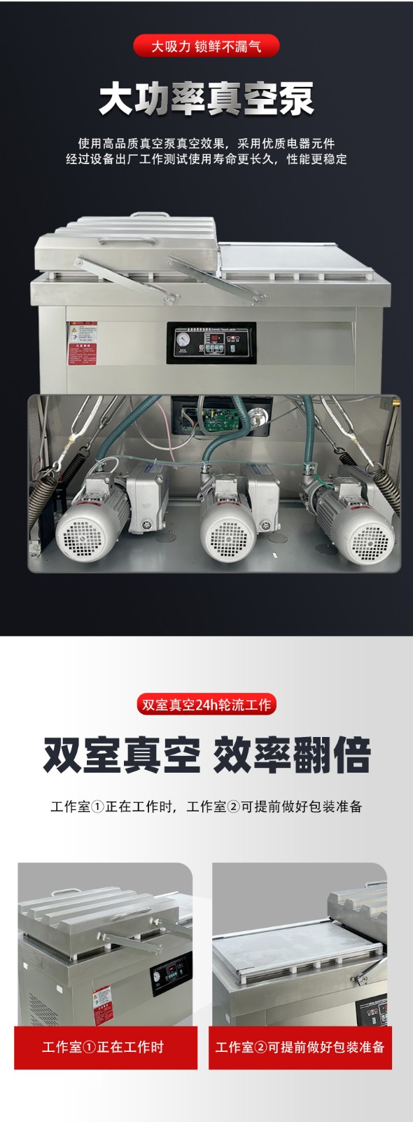 - 循環往復:左室、右室始終保持 “一室抽真空密封,一室裝袋準備” 的交替狀態,兩個真空室的作業周期無縫銜接,沒有任何空閑等待時間。